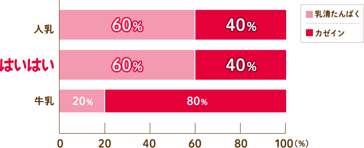 カゼインの比率は20:80です。カゼインは胃の中でカード化(凝固)し、赤ちゃんの消化の負担になります。
