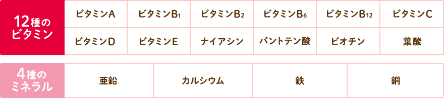 ※ 12種のビタミン(V.A、V.B1、V.B2、V.B6、V.B12、V.C、V.D、V.E、ナイアシン、パントテン酸、ビオチン、葉酸)、4種のミネラル(亜鉛、カルシウム、鉄、銅)