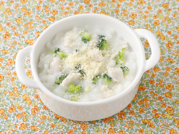 3. (2)に軟飯と牛乳を加えて混ぜながら煮込み、粉チーズをかけます。
