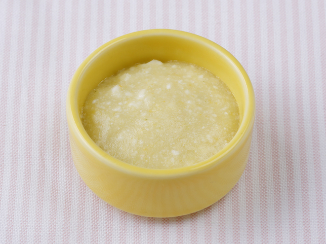- 「手作り応援 白身魚と緑黄色野菜」をお湯20ml(小(xiǎo)さじ4杯)でゆるめに溶きます。